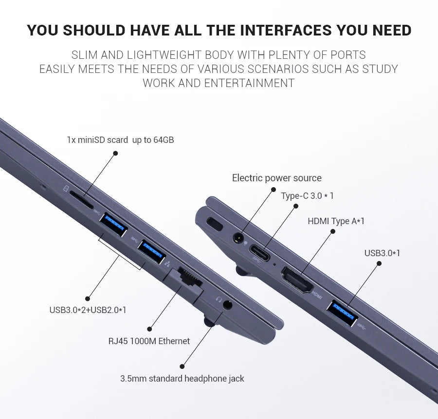 Connectivité complète : Wi-Fi 5, Bluetooth 4.2, ports USB Type-C, HDMI, RJ-45 et jack audio 3,5 mm