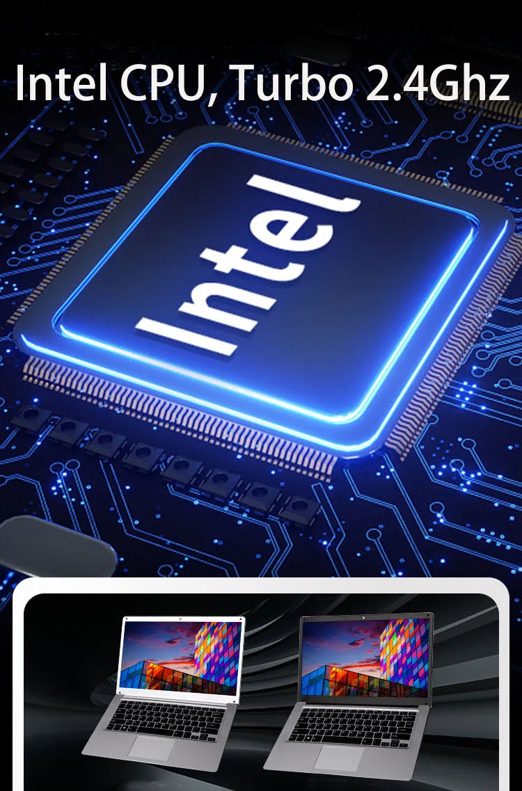 Processeur Intel Celeron N3150/N3350 double cœur, fréquence jusqu’à 2,4 GHz.