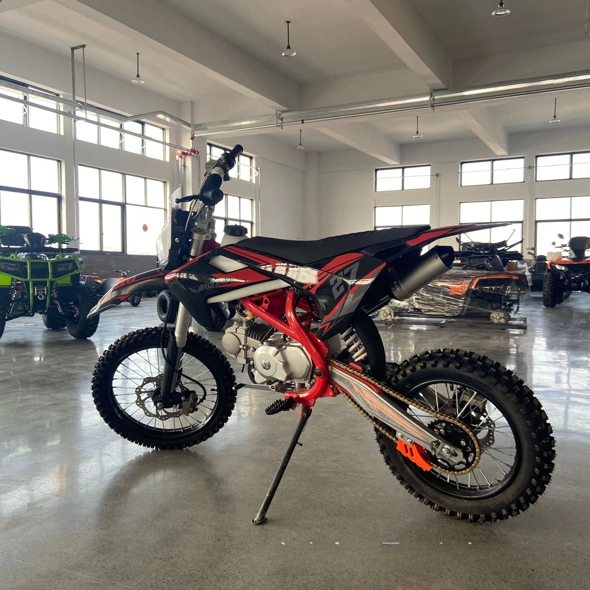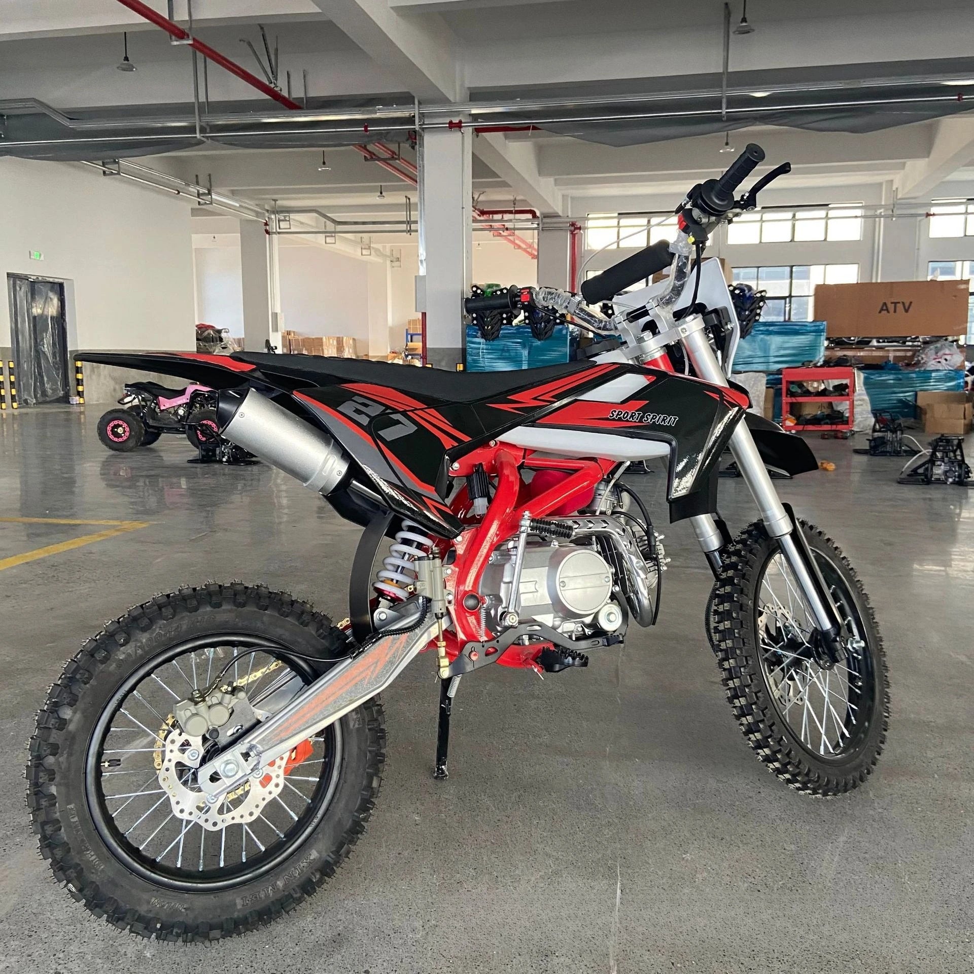 Avec un moteur à embrayage manuel, un système de démarrage double (électrique et manuel), des freins à disque hydrauliques avant et arrière, et une suspension tout-terrain à airbag intégré, cette moto est prête à affronter tous les terrains : montagne, sable, forêt, ou piste.
