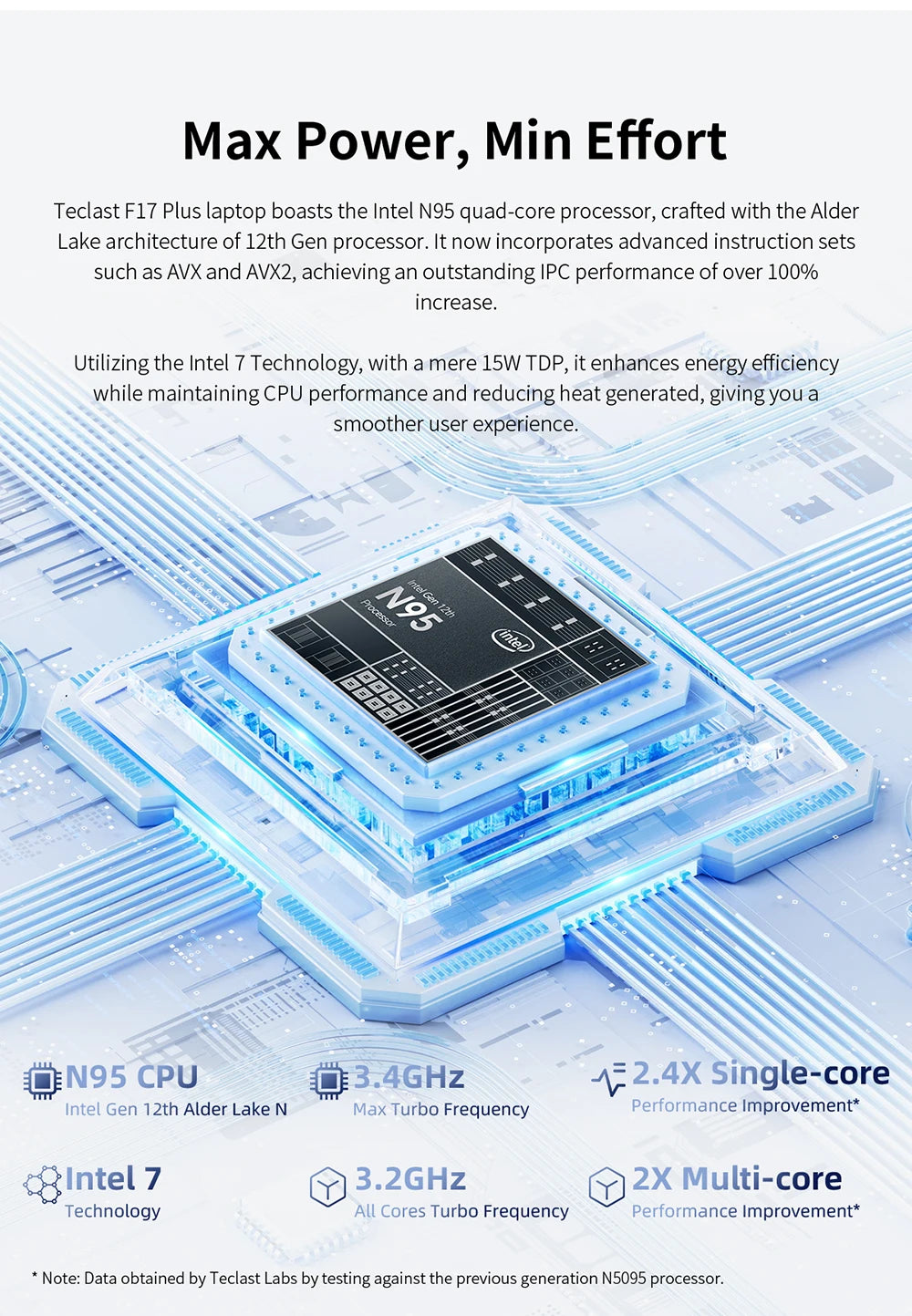 Le Teclast F17Plus est équipé d’un processeur Intel N95 4 cœurs, avec une fréquence de base de 1.2 GHz et un turbo jusqu’à 3.4 GHz. Couplé à une carte graphique Intel UHD intégrée, il assure des performances fluides pour la bureautique, le streaming et les tâches multitâches.
