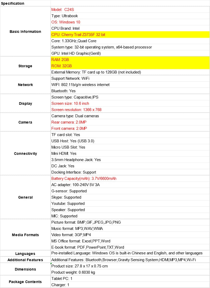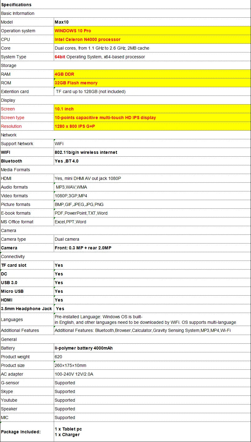Tablette Glavey 10,1" Windows 10, 4 Go RAM, 32 Go, Dual Core, Caméras doubles, Wifi, HD IPS